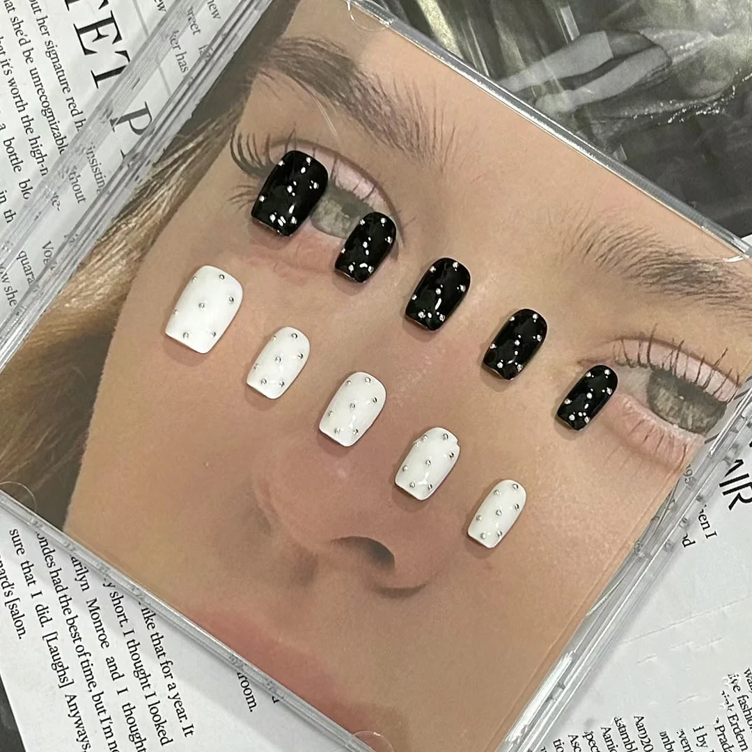 10pcs Handmade Press on Nails Short y2k Sliver Bead Design Fake Nails White Black Artificial False Nail Patch Wearable Nails