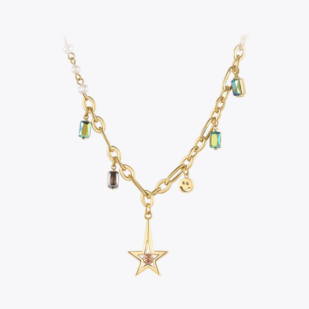 This necklace mixes lucky and natural multiple color elements such as zircon, smiley face, pentagram, pearl chain, etc. full of nature, brings a lucky, natural world of life; designed for all kinds of celebratory occasions.
