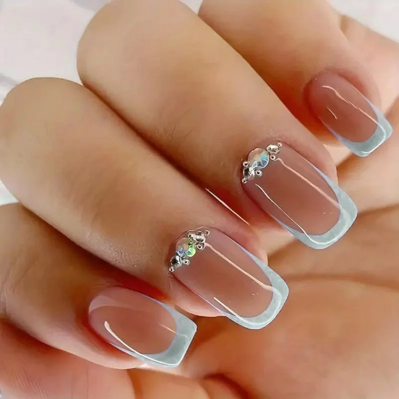 Imaginarygam 24pcs Medium Square Press on Nails with Glue Blue French Style False Nails with Rhinestone Reusable Women Minimalist Removable Nail stickers