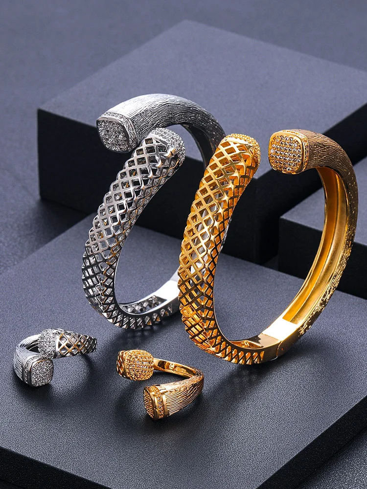 Janekelly Luxury Unique African Bangle Bracelet Ring Set For Women Wedding Cubic Zircon Crystal CZ Dubai Bridal Jewelry Set