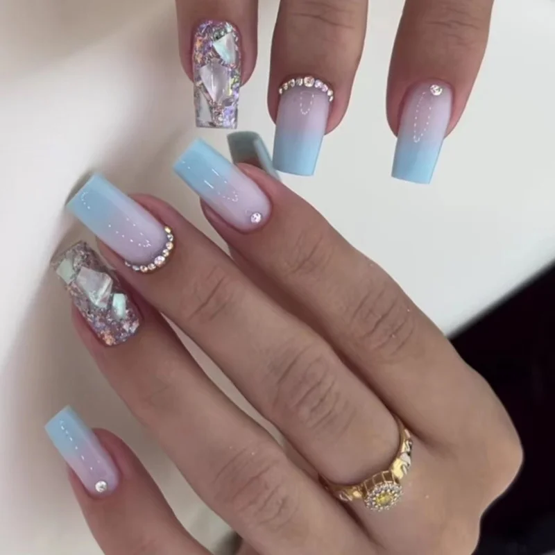 Jollyhunt 24pcs Short Square Wear Nail Gradient Blue Fake Nails with Design French Medium Long Press in Nail Summer False Nails Glitter Nail stickers