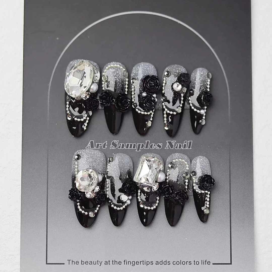 Joystickhouse 10Pcs luxury Black French Style Fake Nails Handmade Almond Press on Nails Rhinestone Decor Wedding Nails Tips Wearable Manicure Nail stickers